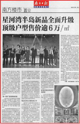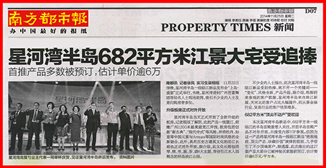 同樣,聚焦星河灣半島產(chǎn)品的還有《南方都市報(bào)》,該報(bào)亦在11月25日樓市版,以通欄的圖文報(bào)道形式,詮釋了該項(xiàng)目682平方米江景大宅受追捧。本次星 河灣半島新品中,682平方米一線臨江的半島宮殿最惹人關(guān)注。這一產(chǎn)品將星河灣半島一線臨江新品絕版地段、頂尖產(chǎn)品、珍藏價(jià)值演繹到極致,幾乎吸引了 不少頂端客戶。該報(bào)如是評(píng)價(jià),闡述了對(duì)星河灣的熱捧。