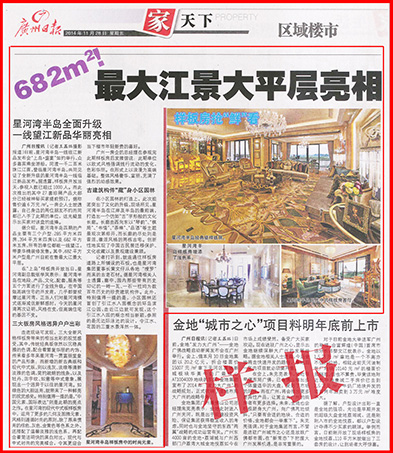 11月28日,《廣州日?qǐng)?bào)》在樓市版重磅推出星河灣圖文報(bào)道,以大半版面篇幅聚焦星河灣半島682平方米戶型廣州目前在售最大江景大平層。
