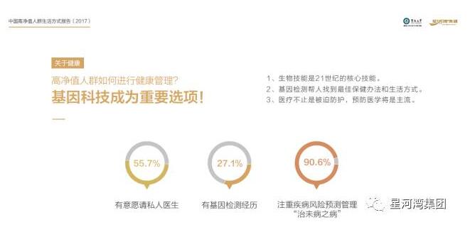 他們信賴醫(yī)學(xué)科技,高度注重健康,健康管理方式比普通人更加超前。27.1%有過(guò)基因檢測(cè)經(jīng)歷,55.7%有意愿聘請(qǐng)私人醫(yī)生。