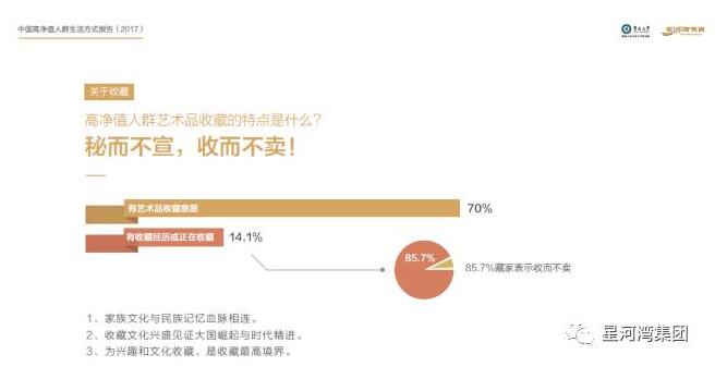他們不是土豪,比起炫耀性消費(fèi),他們更注重品質(zhì)化的個(gè)性消費(fèi)。《報(bào)告》顯示:89.7%高凈值人群中青睞私人定制。他們也喜好收藏。57.4%有藝術(shù)品收藏意愿。比起珠寶玉石,他們更青睞字畫。在高凈值人群看來(lái),收藏是為了滿足興趣文化愛(ài)好,85.7%表示收而不賣。